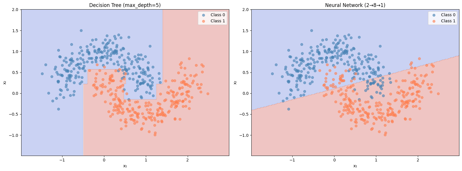 plot_decision_boundary(nn_predict, X, y, 'Neural Network (2→8→1)' , ax= axes[1 ])
