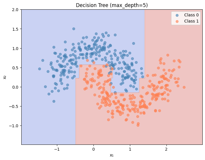 plot_decision_boundary(dt.predict, X, y, 'Decision Tree (max_depth=5)' , ax= axes[0 ])